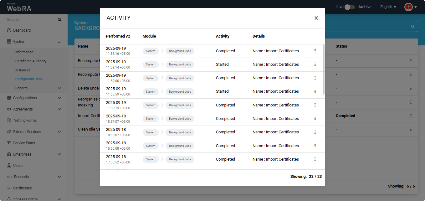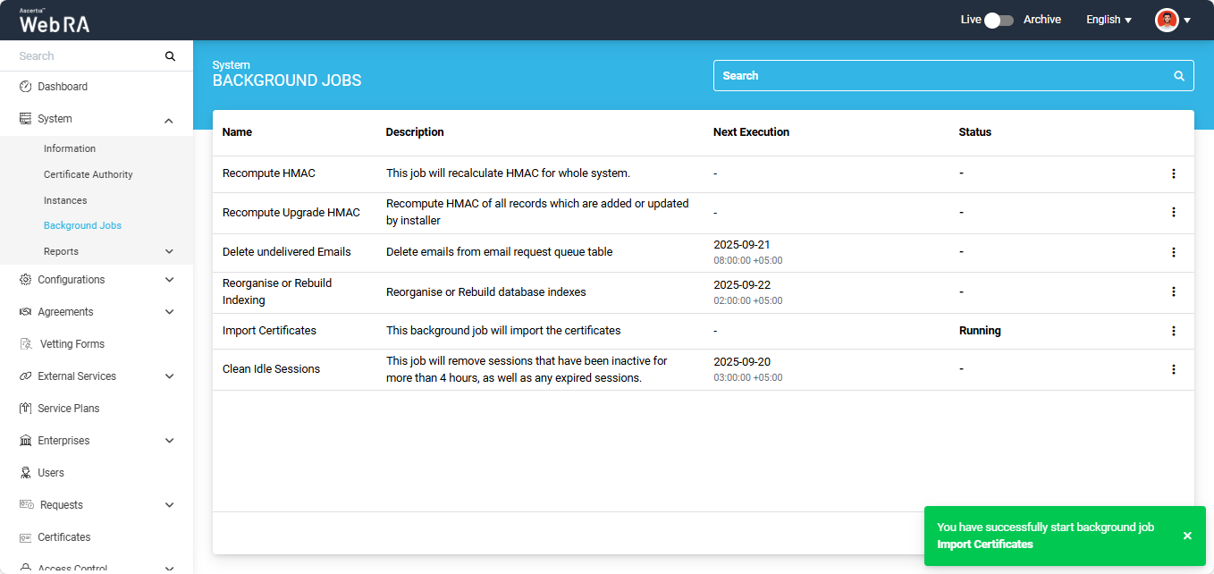 To access the Import Certificates module, expand System > Background Jobs > Import Certificates from the left menu of the Web RA Admin Portal.