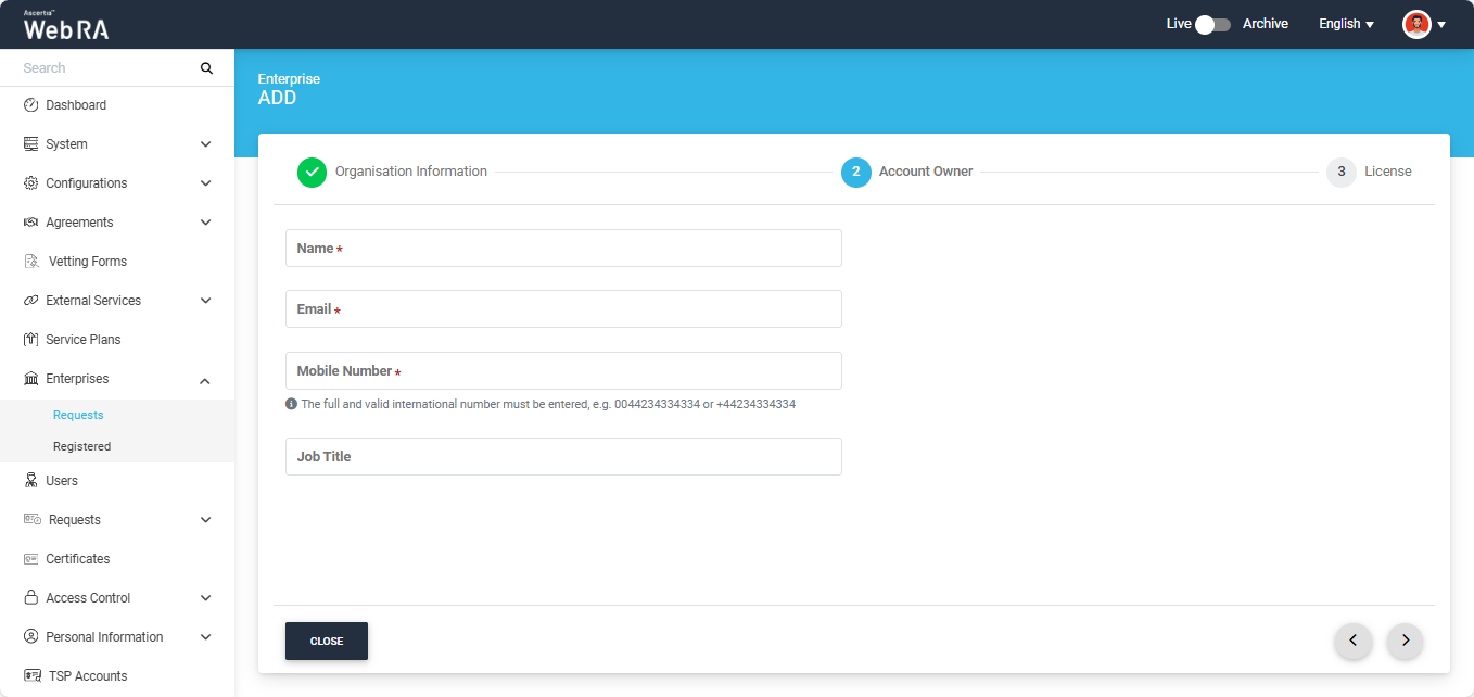 On this screen, mention the details of the enterprise owner and click next to navigate to the License screen.