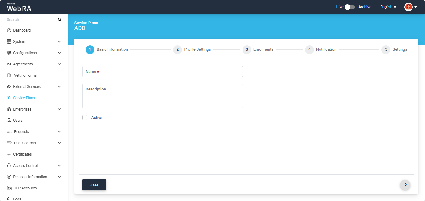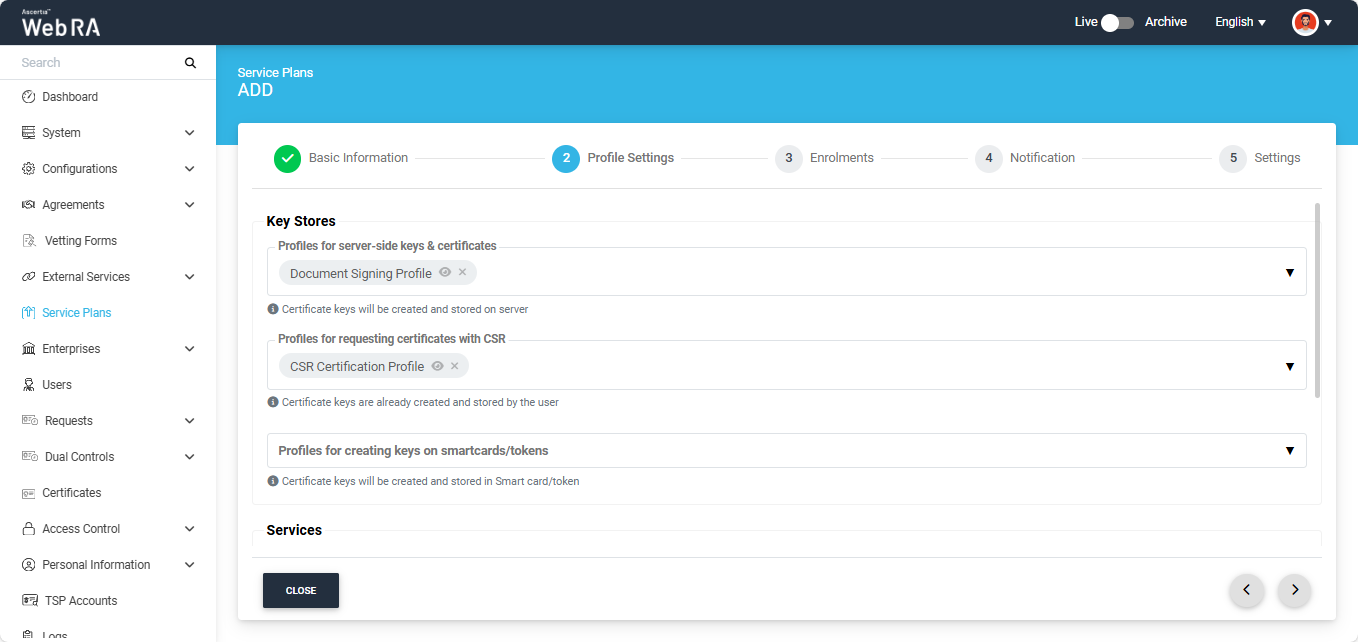 The next step is to create a ‘Service Plan’ in the ADSS Web RA.