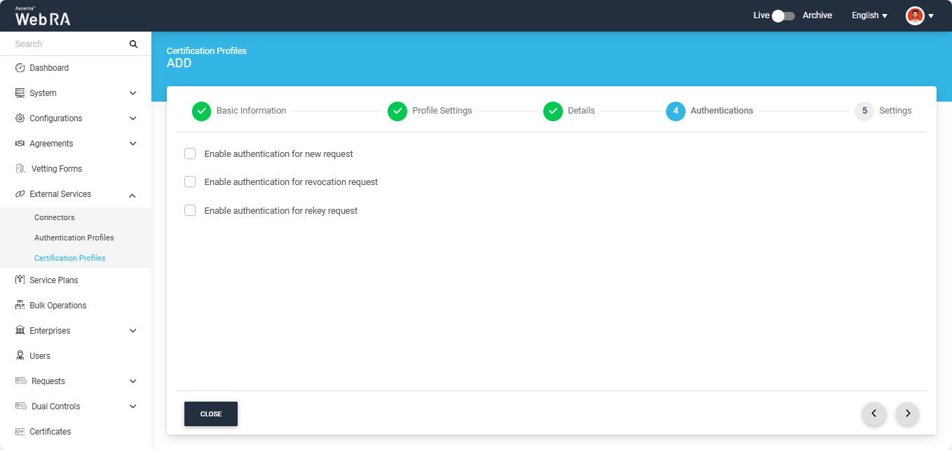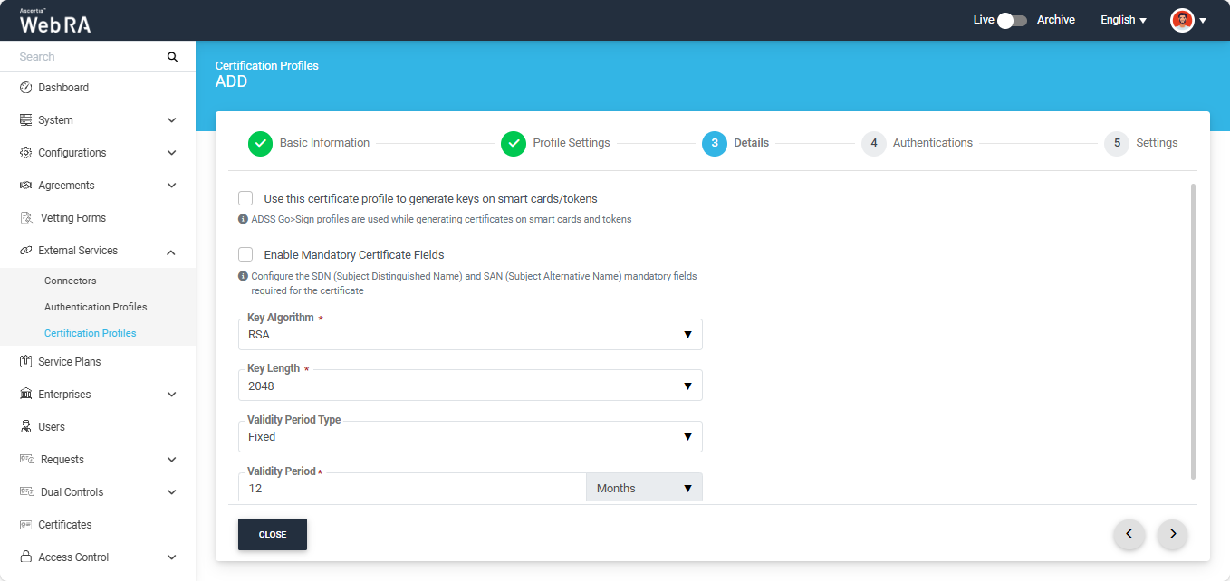 To view complete details on how to create different types of certification profiles in the ADSS Web RA system, refer to the 'Certification Profiles' section.