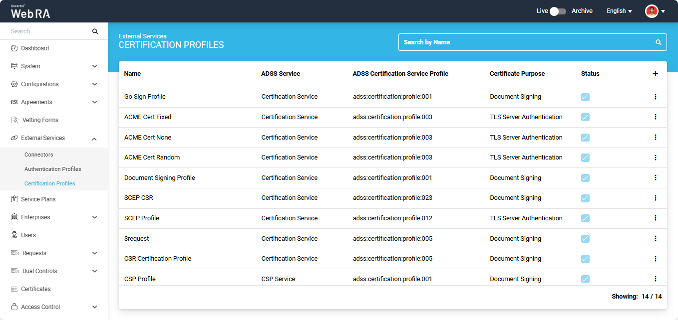 From the admin portal, expand External Services > Certification Profiles from the left menu to see the certification profiles listing screen.