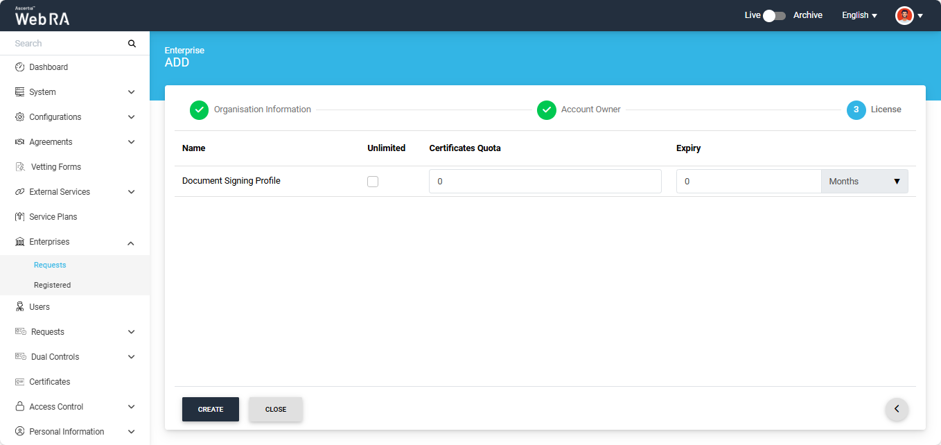 Assign the license quota from this screen for each certification profile and click ‘Create’.
