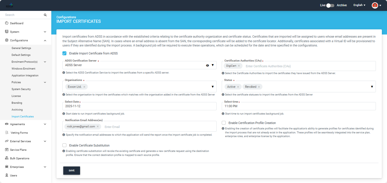 The system will open the import certificates configuration page. Here, you can make the required changes in the configurations and implement them by clicking ‘Save’.