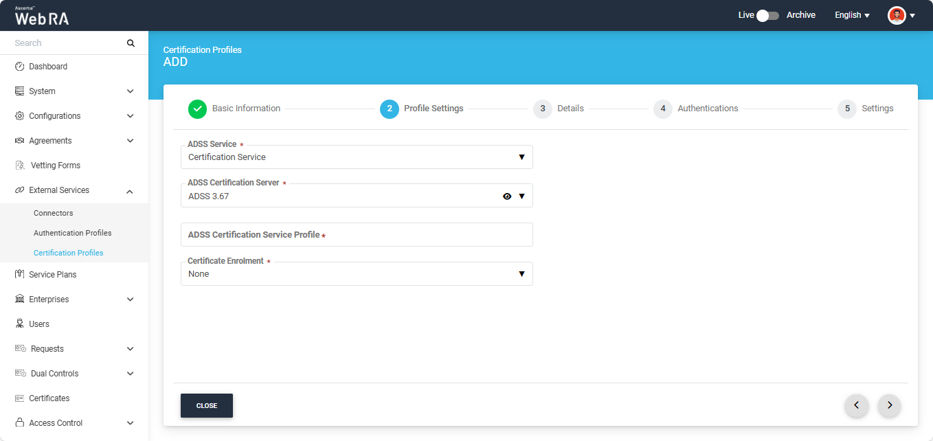 Certification profiles define all the necessary configurations and business requirements, such as CA details, key algorithm, and validity, to issue the corresponding certificates for ADSS Web RA users.