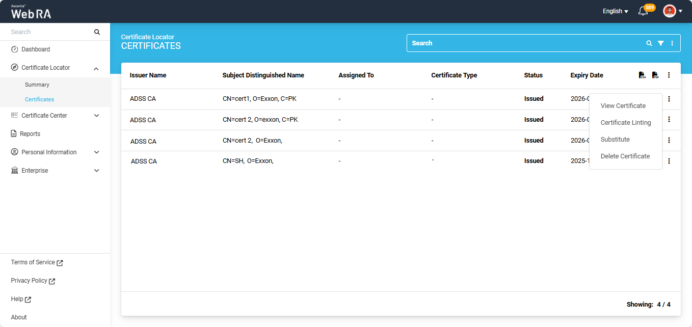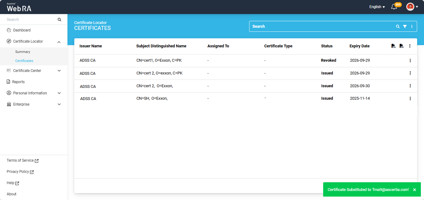 The status of the substituted certificate will appear as ‘Revoked’ in the ‘Certificates’ listing.