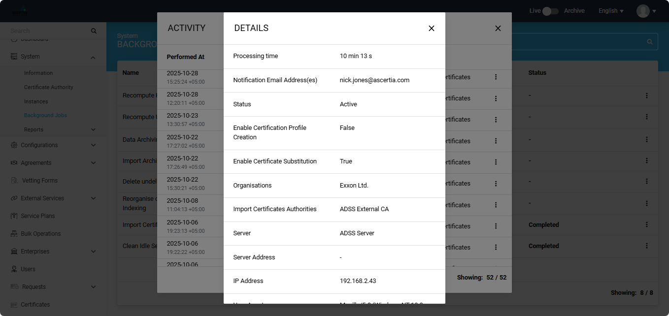 This background job will import the certificates from the ADSS Server and generate an import certificates report. The report will then be shared on the email address(es) specified when scheduling the ‘Import Certificates’ background job.