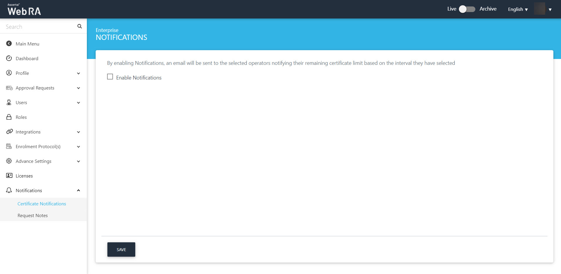 Tick the checkbox "Enable Notifications", an email will be sent to the selected operators notifying their remaining certificate limit based on the interval they have selected.