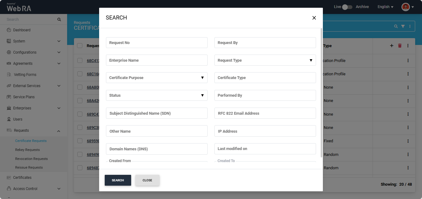 An operator will only be able to delete a certificate request permanently if he has enabled permanent deletion from the Policy section.