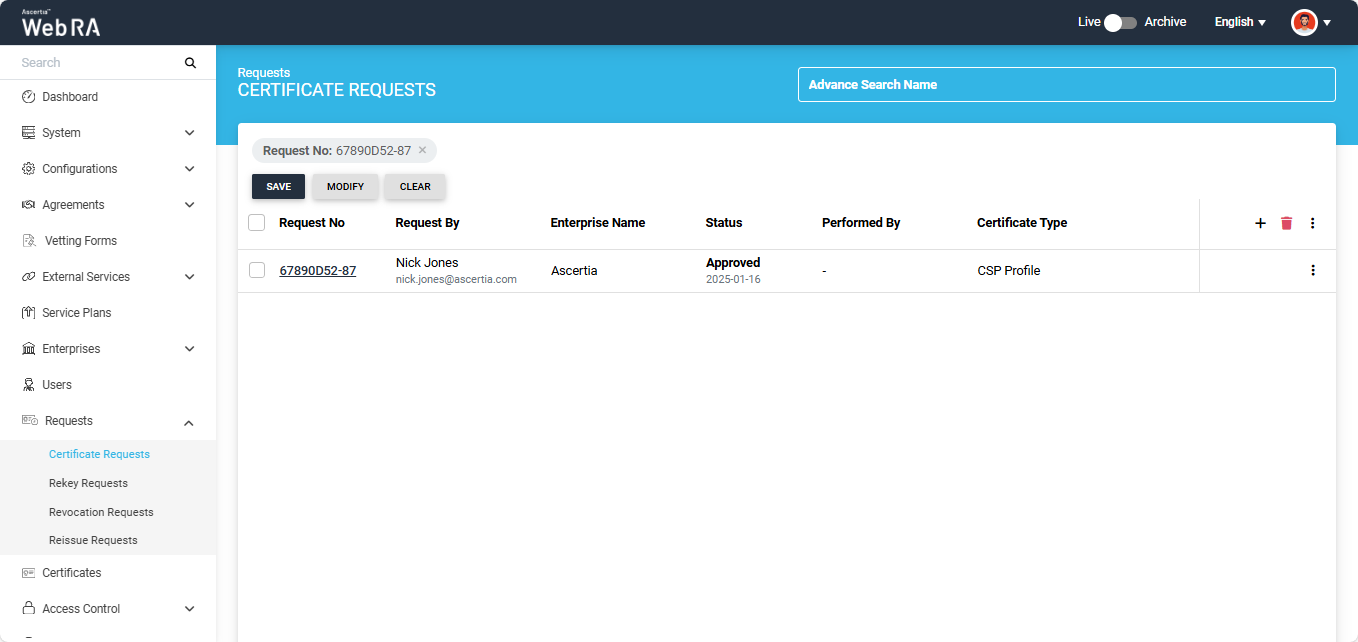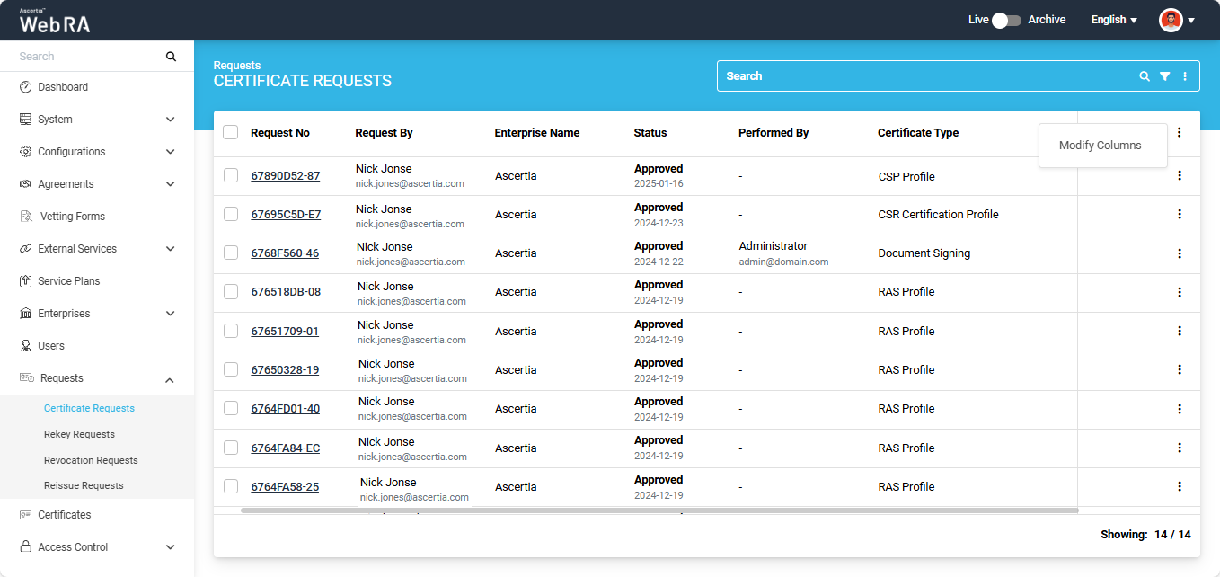 - Expand Requests > Certificate Requests from the left menu.