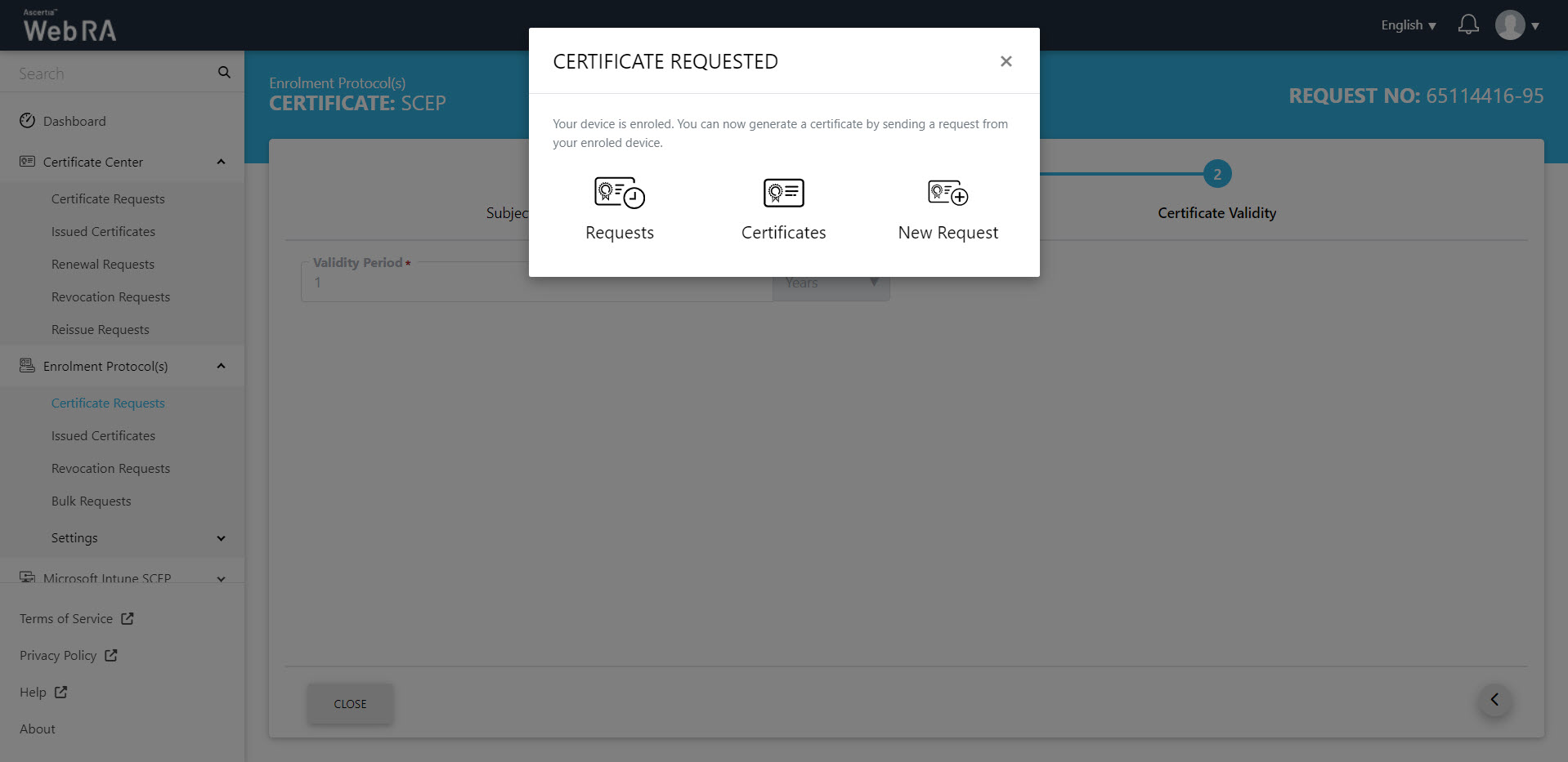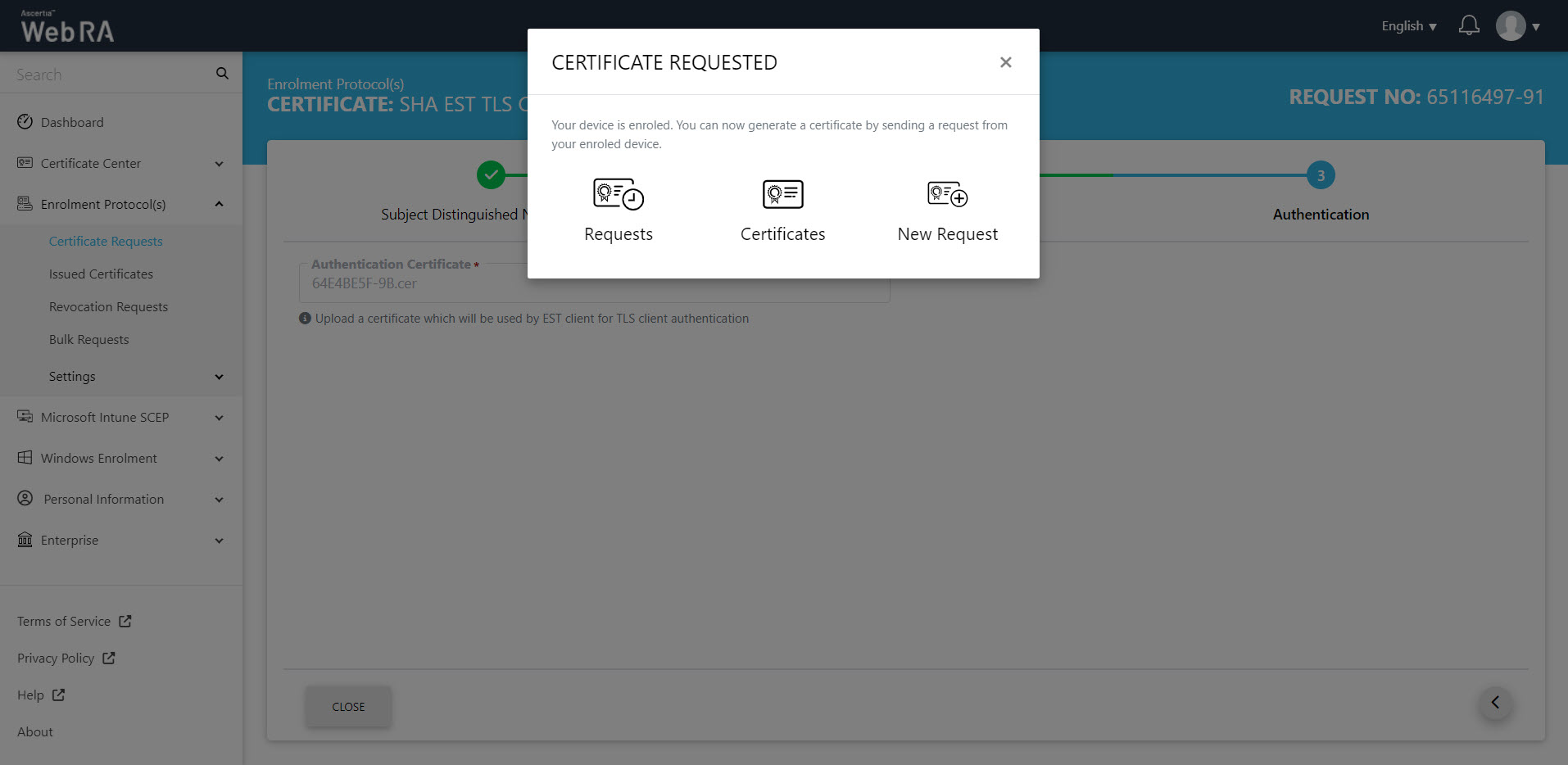 - The Certificate Requested tab will appear, stating that your device is enroled.
