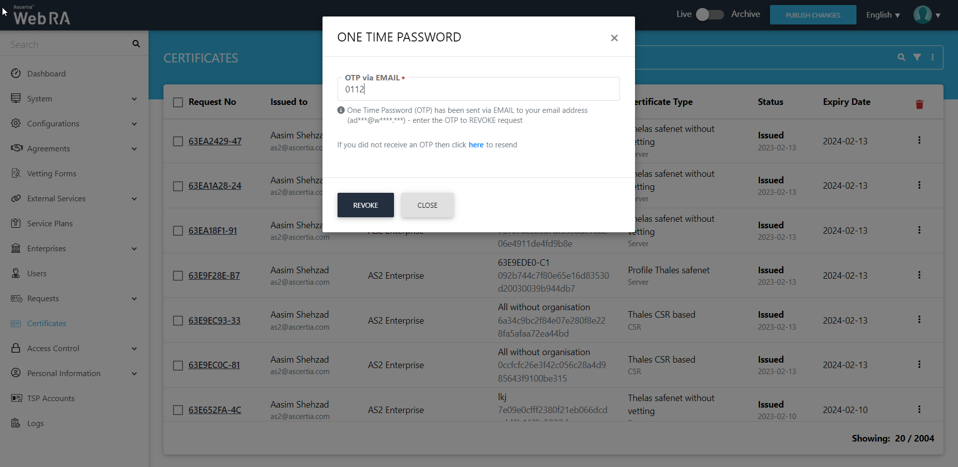 Once you select the action, certificate revocation reason drop down will be displayed, you can also add an optional message, tick the confirmation message and click "Revoke". Then the OTP screen will appear: