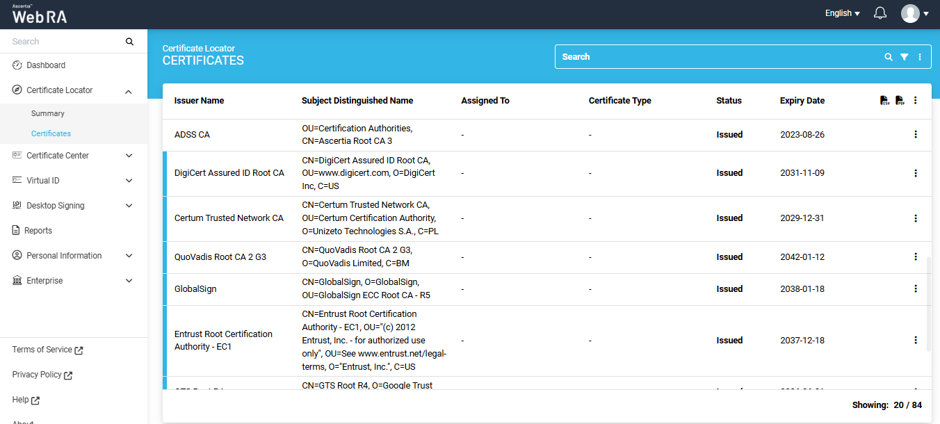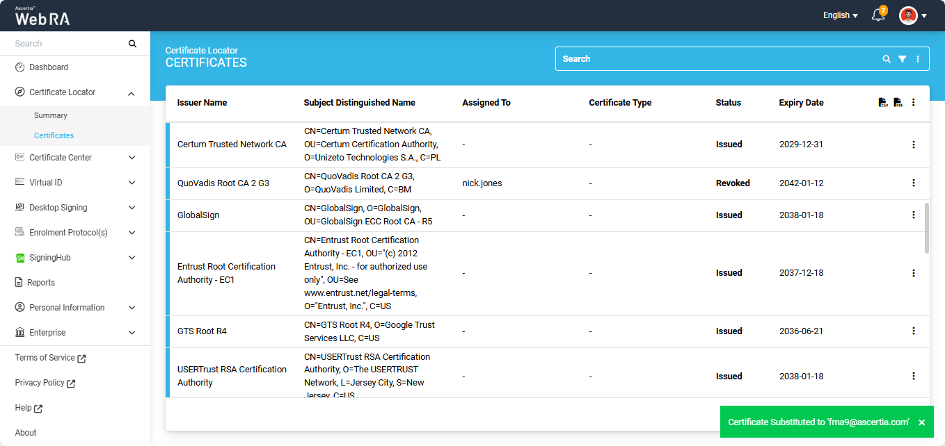 The status of the substituted certificate will appear as ‘Revoked’ in the ‘Certificates’ listing.
