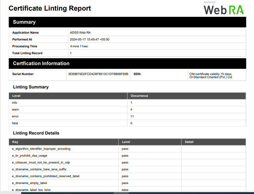After selecting the desired linting sources, click the ‘Generate’ button to create the Certificate Linting Report.