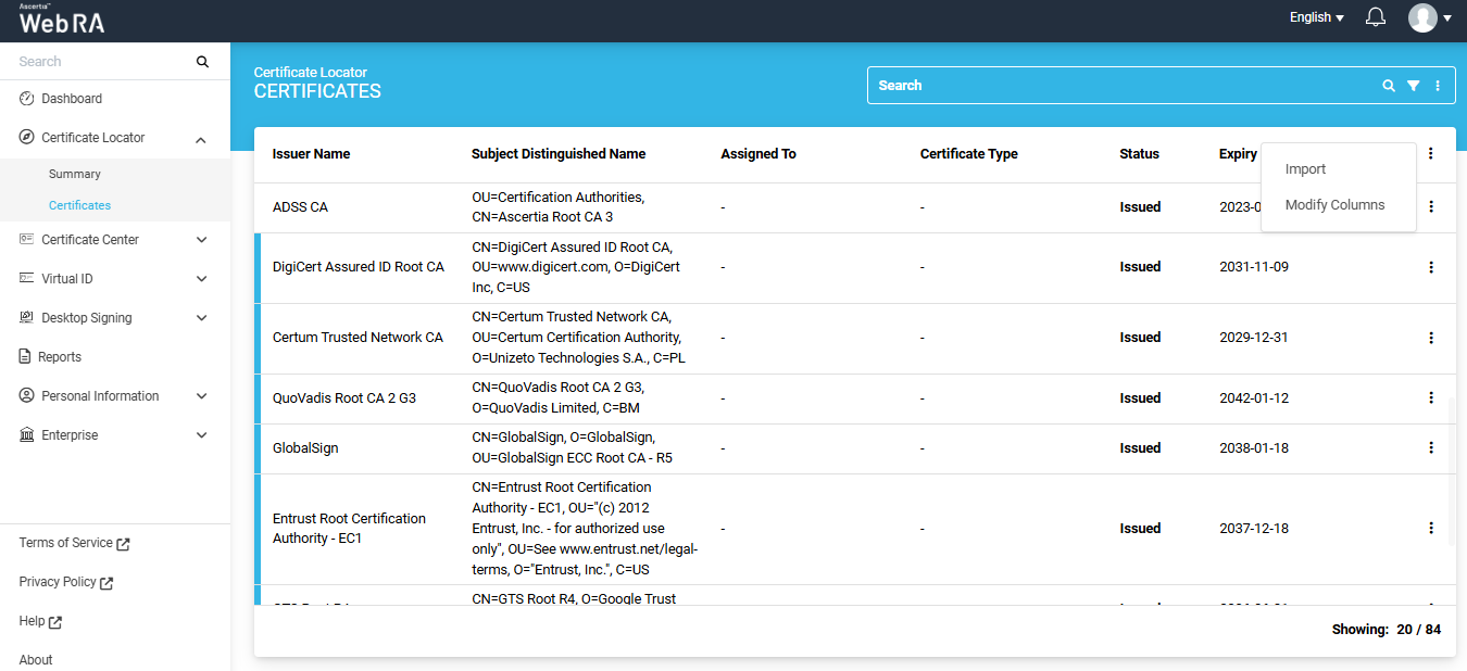 In this section, you can view the list of certificates imported from network hosts, local CAPI, and Java key stores.