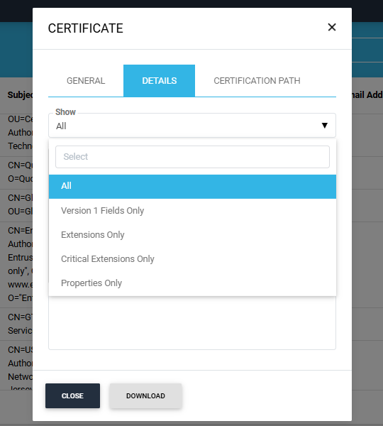 A "Show" dropdown appears in the Details tab. Users can choose to view either all details of the certificate or specific details based on the selected dropdown options. |