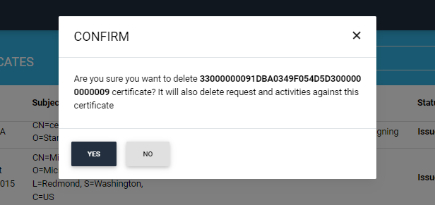 Clicking on the ‘Delete Certificate’ option displays a confirmation box.