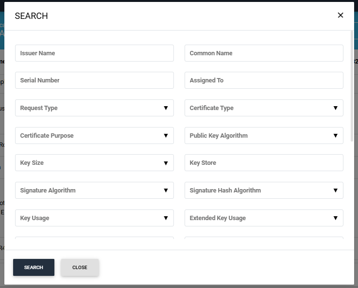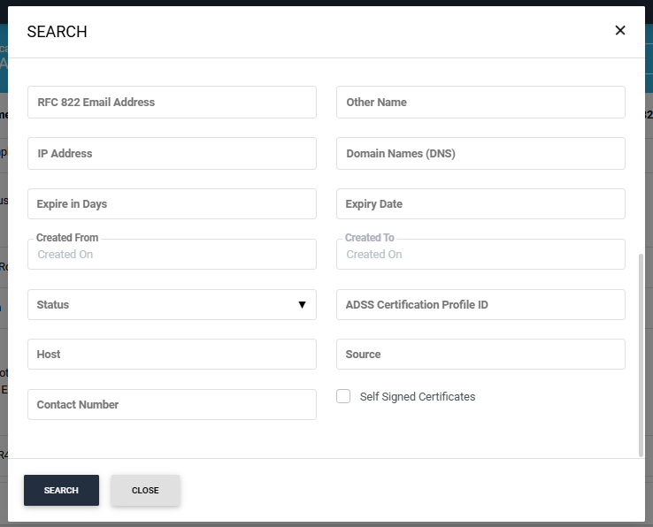 The Advanced Search feature allows users to perform detailed and refined searches within the certificate section. By applying specific filters and criteria, users can quickly locate the information or items they want to view.