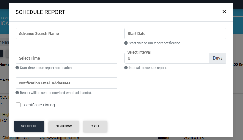 If a user has applied an advanced search filter and wants to create a report of all the certificates that appear based on that search, they can use the ‘Schedule Report’ option.