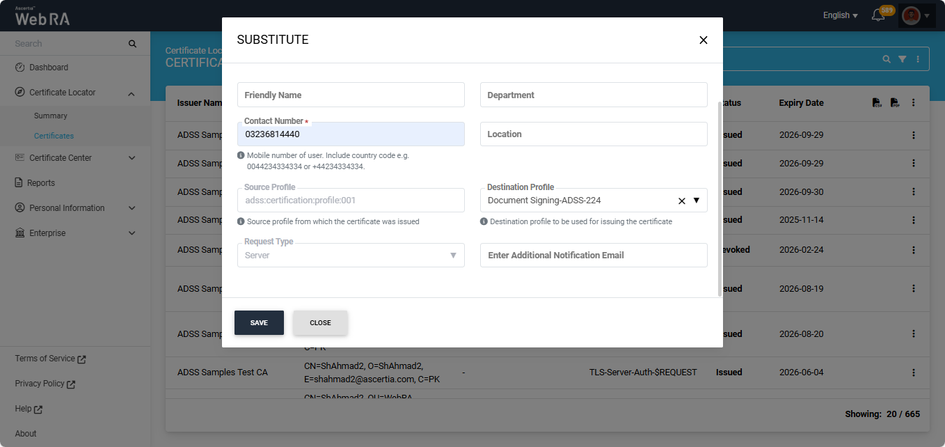 Note: The substituted serial number can be used to check the status of the substituted certificate from the ADSS Server.
