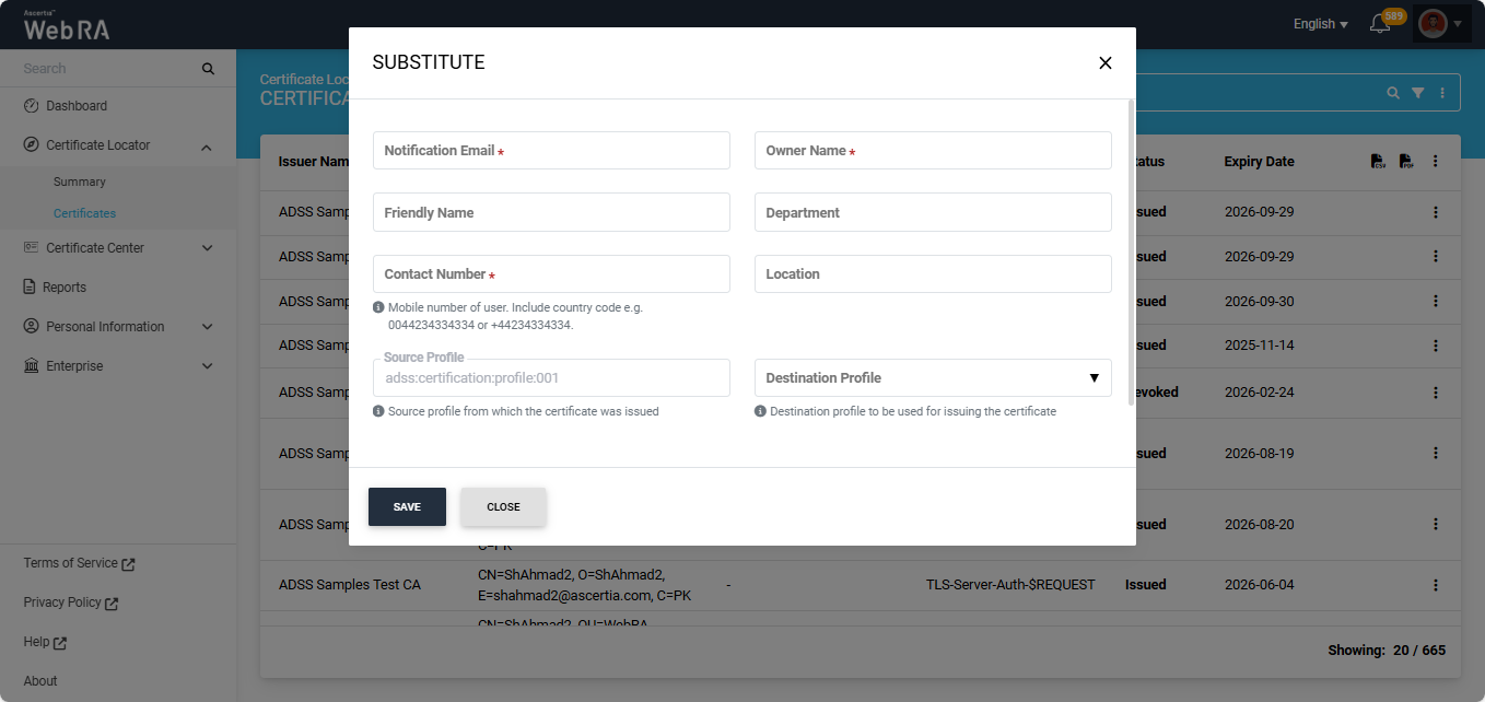 Note: The 'Substitute' option will only appear for certificates imported using the Certificate Substitution configuration. To learn more, go to the 'Import Certificates' section in the Admin portal.