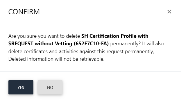 This means that all the certificates, and activities against this request will be deleted permanently. Once deleted, the information will no longer be retrievable.