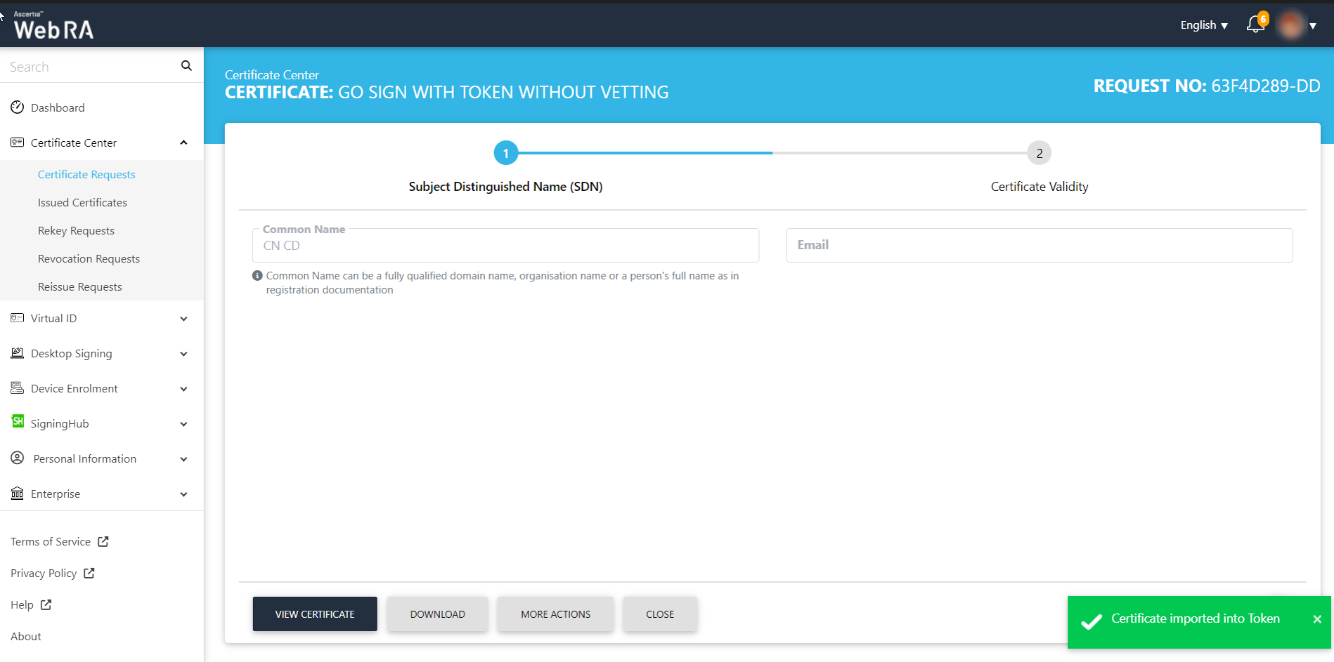 Once the application detects the token and Go-Sign is also running successfully, the following screen is displayed. And once the certificate request is generated, it redirects you to the Certificate Requests listing.
