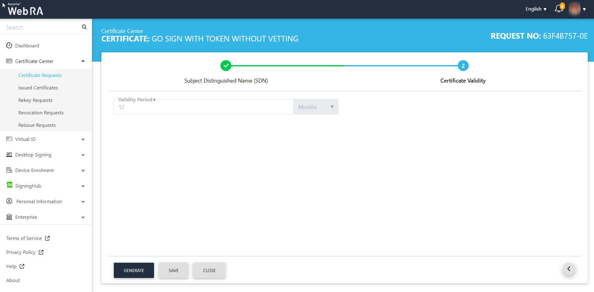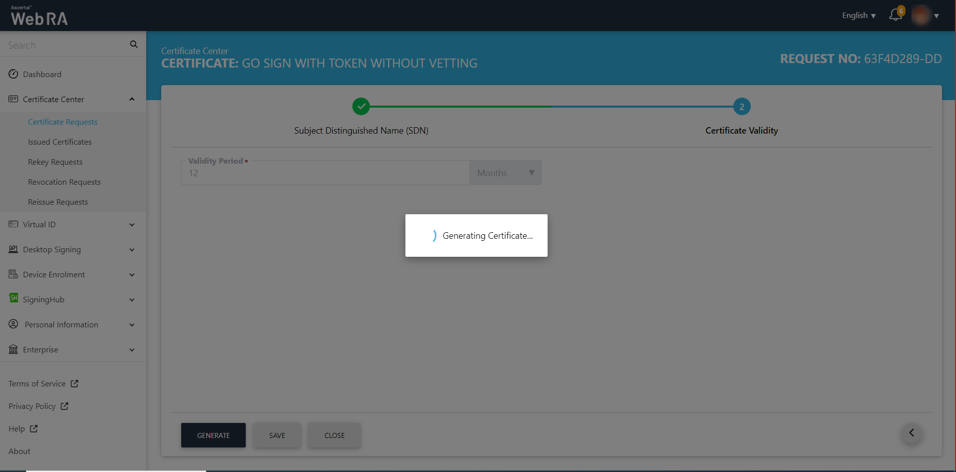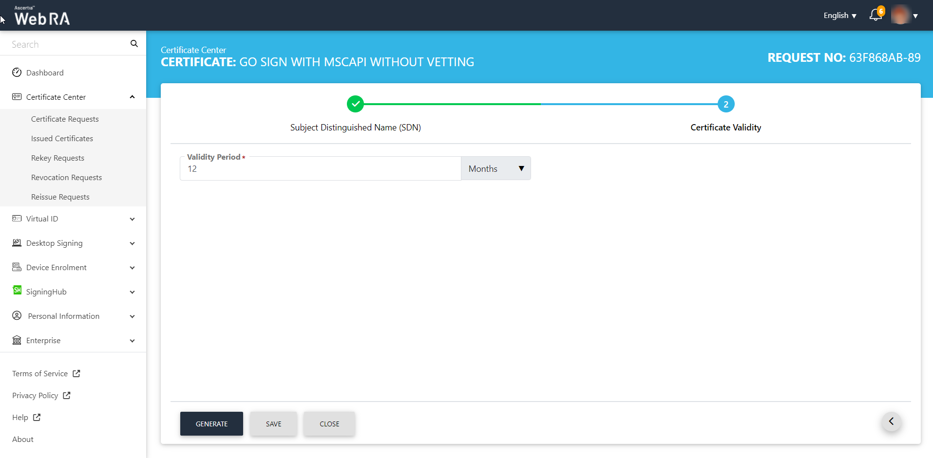 - The certificate validity period will be auto-filled and in a disabled form. Then click Generate.