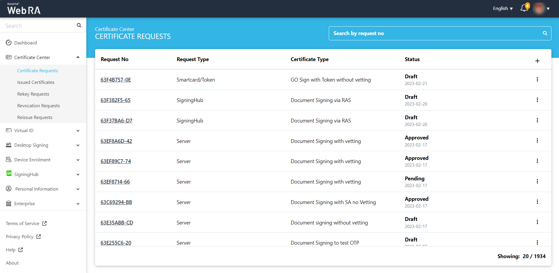 - Login to the ADSS Web RA web portal, expand Certificate Center > Create Requests.