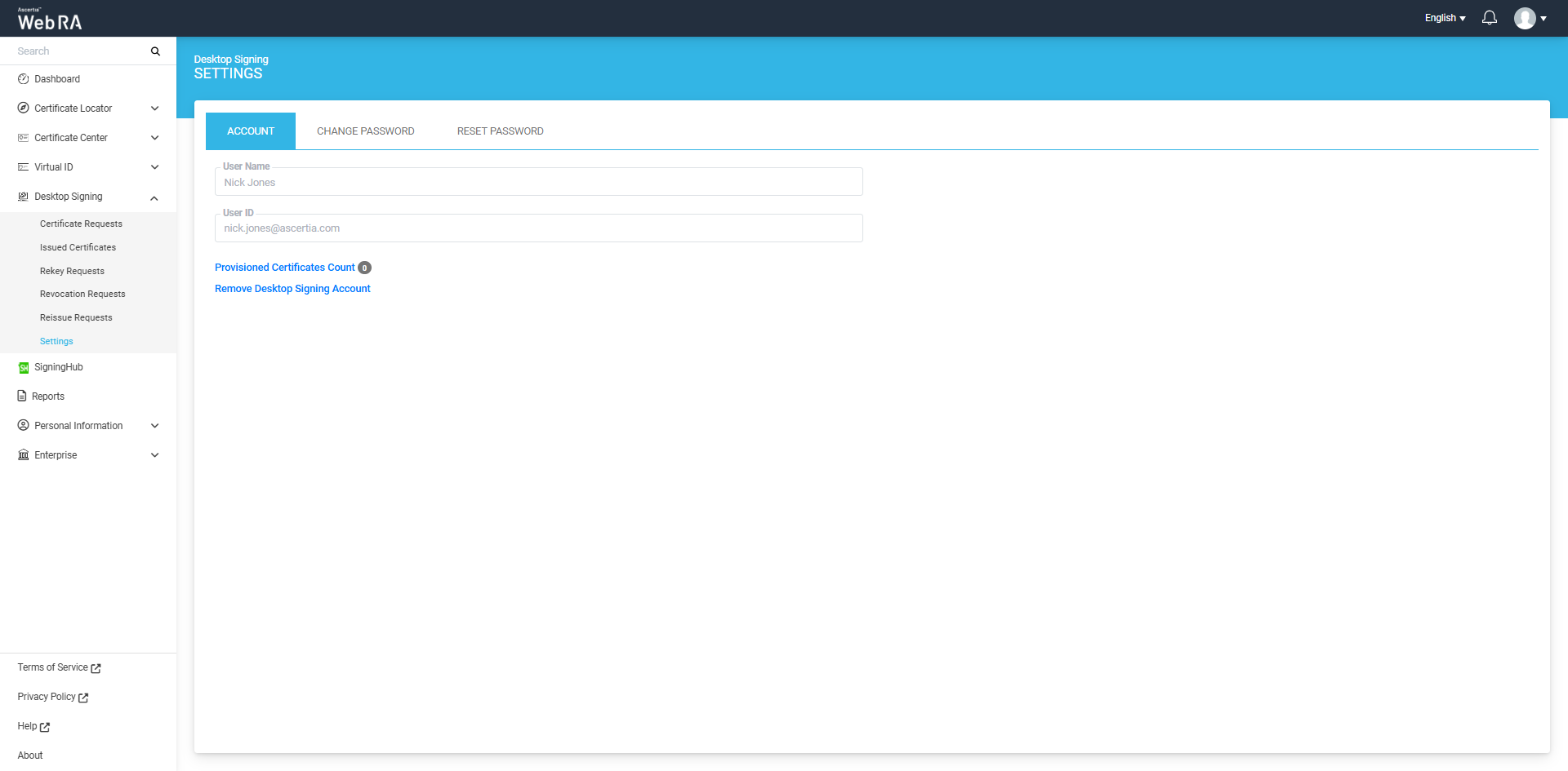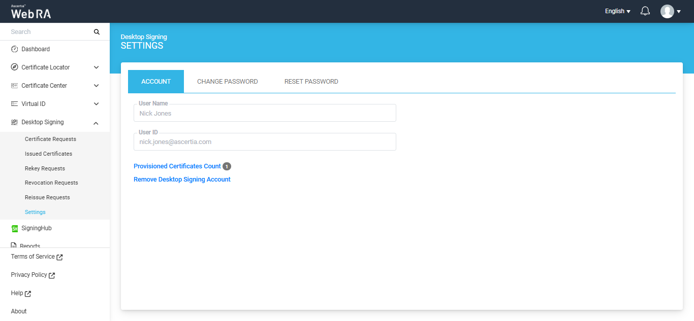 The Desktop Signing user will be created in the Web RA system and the 'Settings' screen will appear.