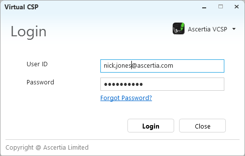 Once the configurations are complete, log in to the VCSP application using your Desktop Signing account credentials. You can access the VCSP login window from the VCSP application icon on your Desktop.