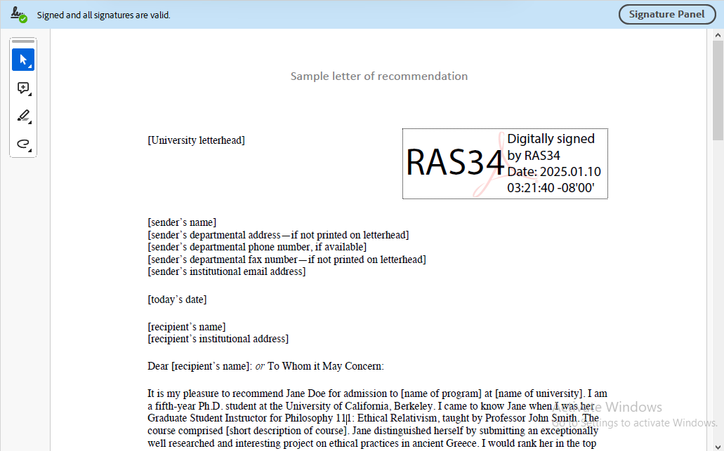 Once the signing request is authorised via the Go>Sign Mobile app, the document will be Signed successfully. The signature field in the PDF document will display the certificate name along with the date and time of signing.