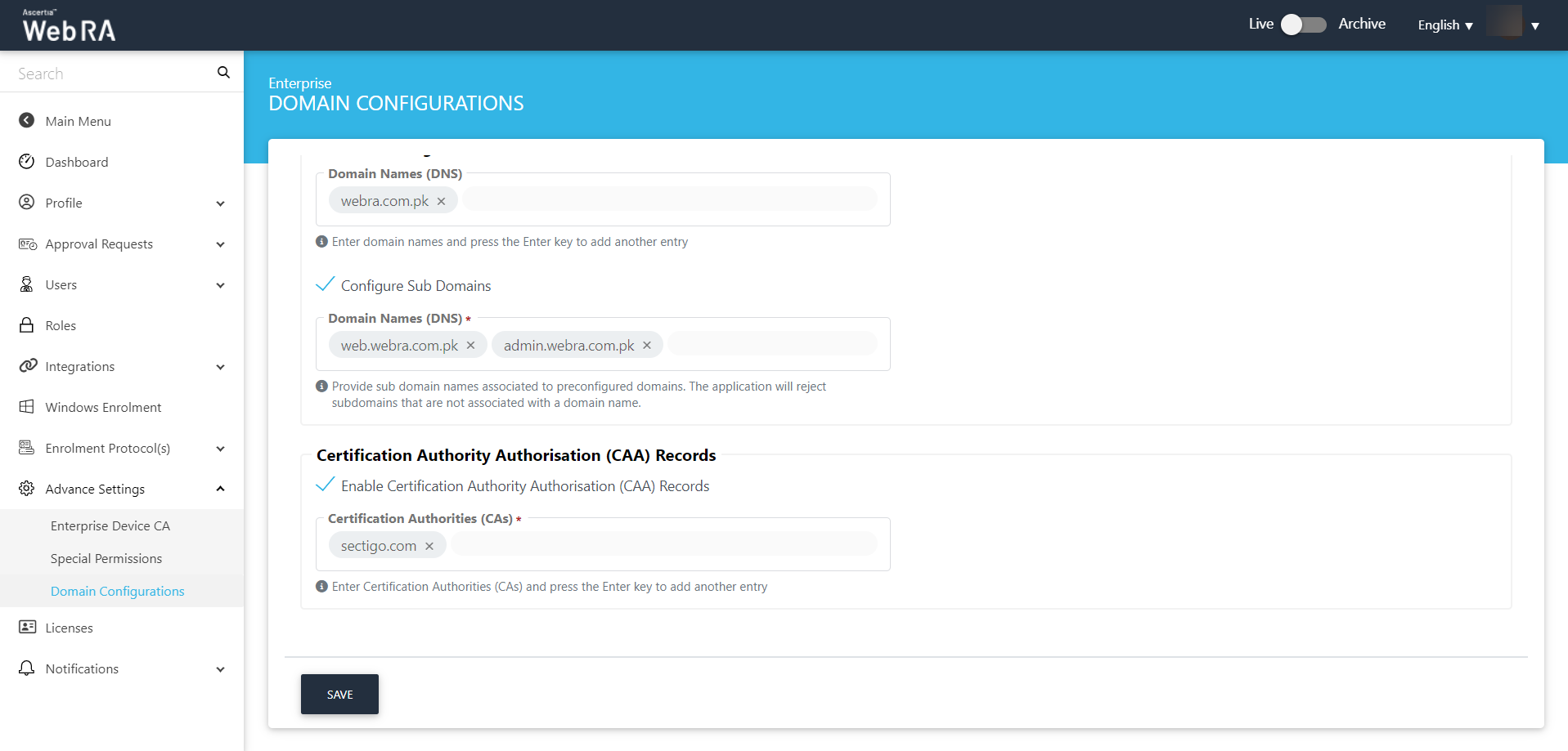 ADSS Web RA supports the configuration of domain names on an enterprise level. In this configuration, you can set domain names and sub domain names associated to an enterprise. The DNS name will be used in the certificate request form for its utilization while generating certificates exclusively from the domains pre-configured within their enterprise.