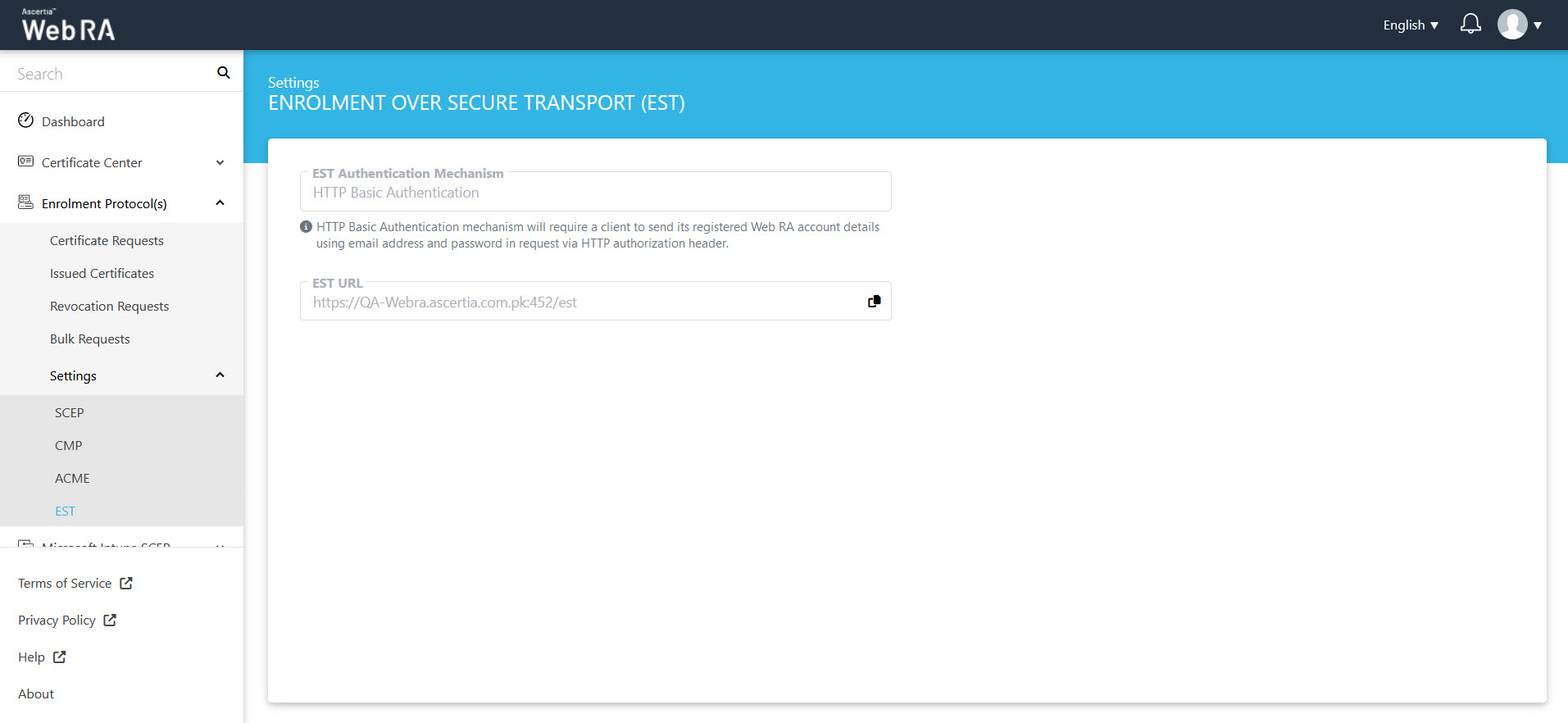 This screen will display disabled fields including the EST authentication mechanism and EST TLS authentication URL that is configured in the ADSS Web RA admin portal.