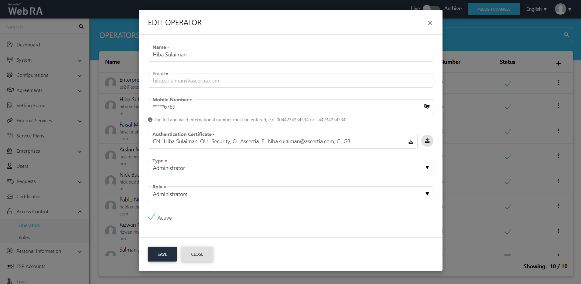 Administration PortalAccess ControlManage Operators Edit an Operator An administrator can Edit (options available by pressing the button) an existing role from the Operators screen.