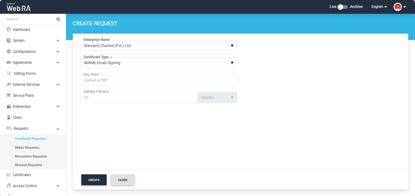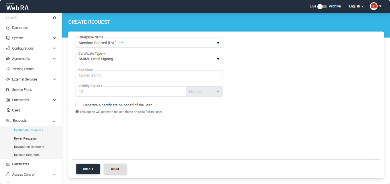 Expand Requests > Certificate Requests from the left menu pane. The Certificate Requests listing screen will appear.
