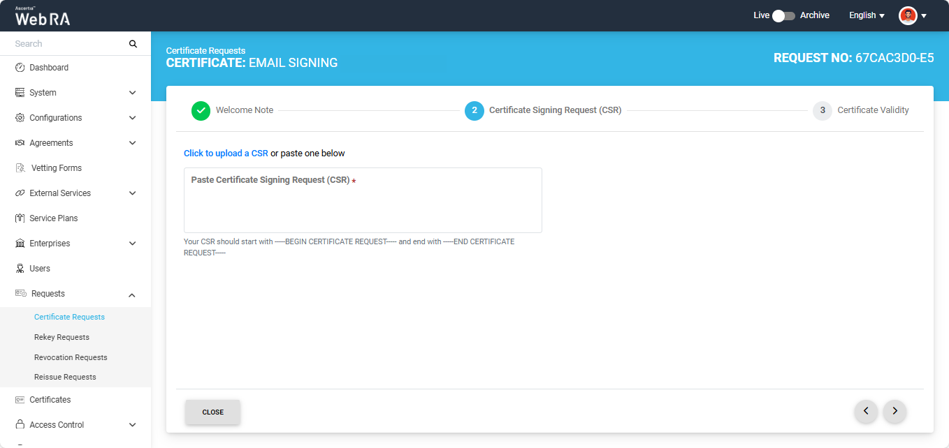 Once you agree to the welcome note and click Next, the upload CSR screen will appear. Here, upload or paste a CSR in the respective box.