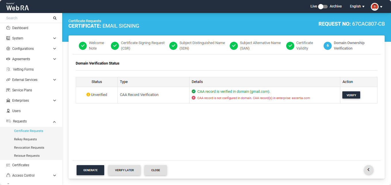If you attempt to generate the certificate while the Domain Verification Status is ‘Unverified,’ the system will display an error dialog prompting you to verify your domain’s CAA records before proceeding.