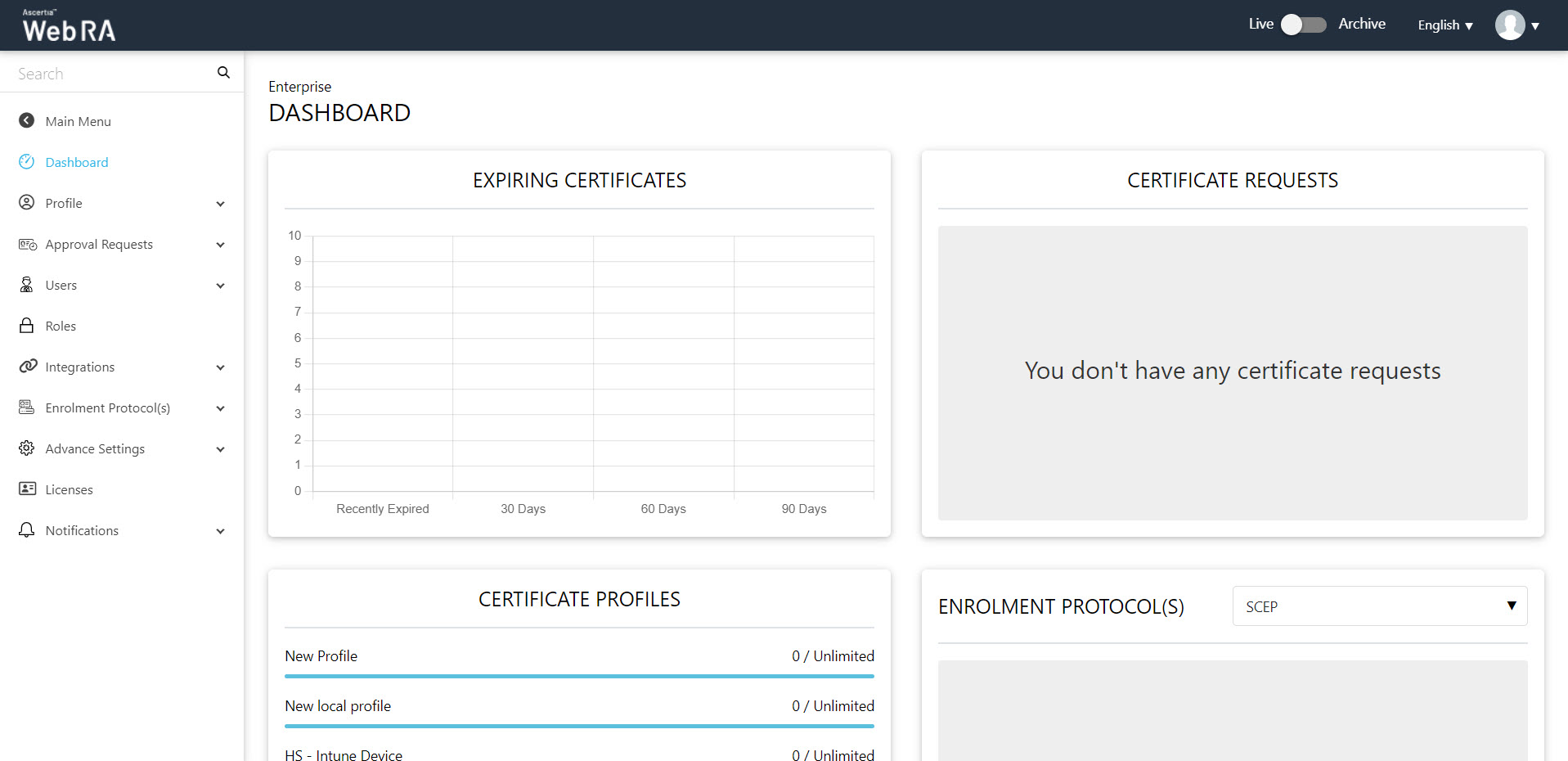 An enterprise dashboard can give an operator a quick and easy overview on the status of certificates, requests, quotas, etc. related to its enterprise.