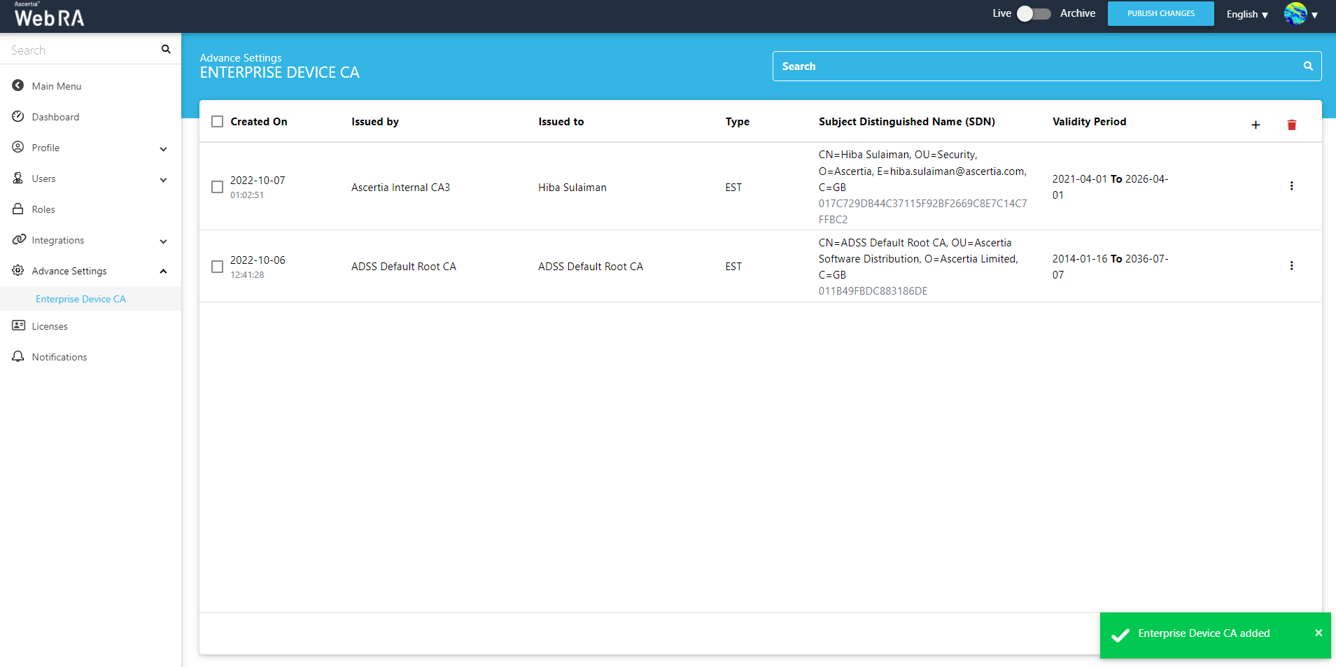 - Click "Advance Settings" from the Enterprise Management menu. The toggle button will lead you to a sub menu, click "Enterprise Device CA".