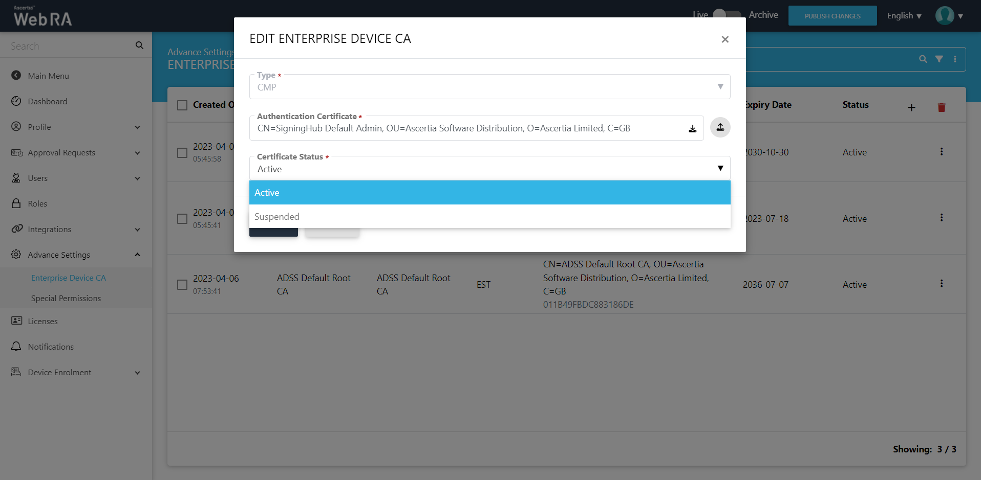 An operator can change the status (active or suspended) of a Device CA certificate from admin in case of CMP and EST protocols (See screenshot below):
