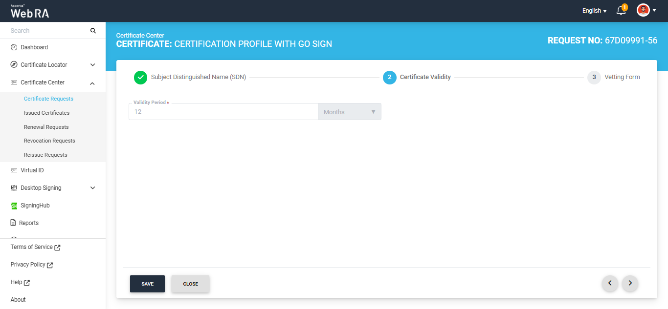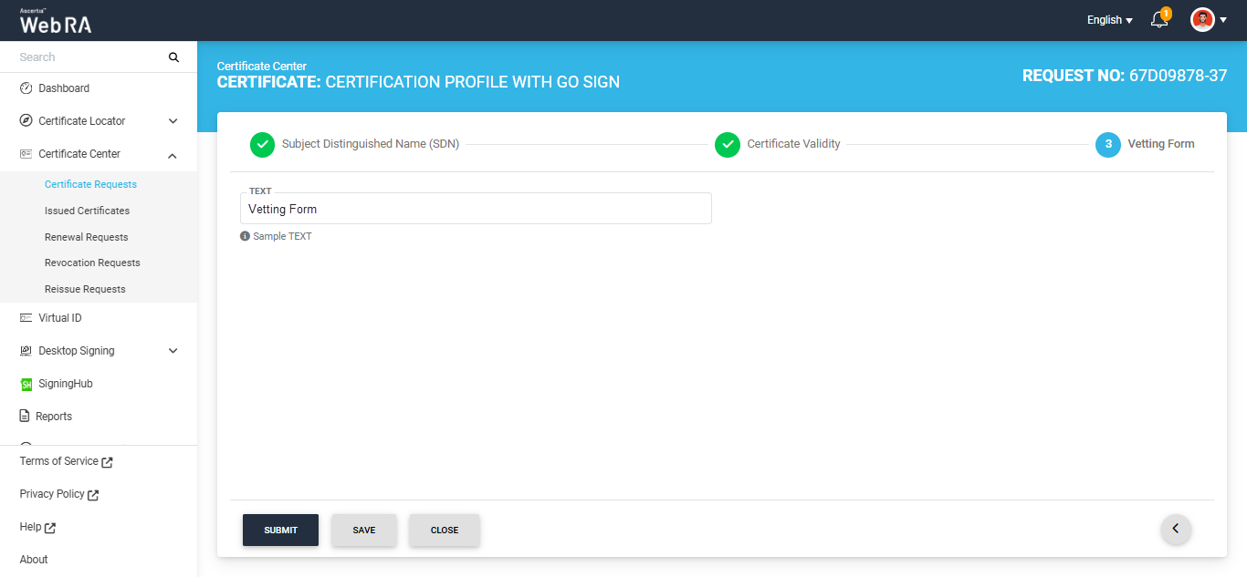 Following are the steps to create a token certificate request for Go>Sign Desktop profile with Vetting enabled.