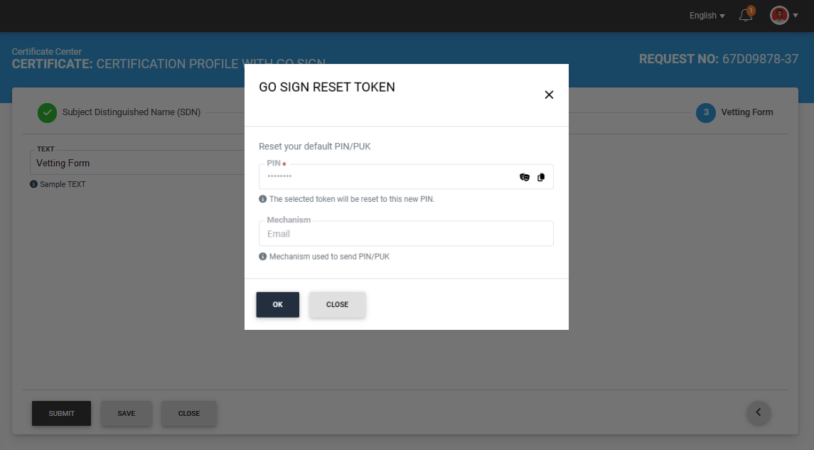 Once you click submit, a dialog titled ‘Go Sign Reset Token’ will appear. This dialog will display the auto-generated value of PIN in disabled form. The user can view and save the value from the respective icons.