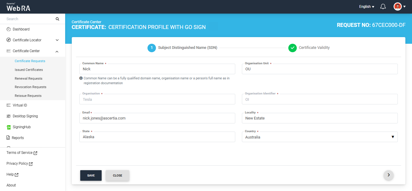 - When a user creates a new certificate request, the SDNs and SANs will be rendered as configured in the certification profile and its values will be auto-filled from the certificate details.