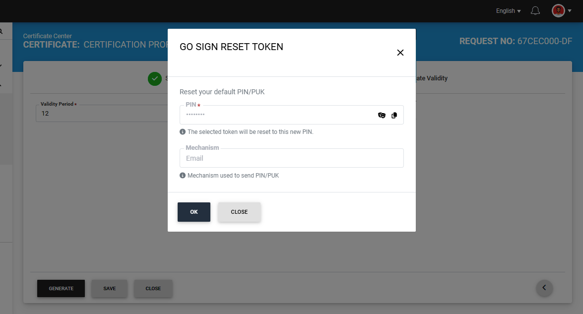 Once you click generate, a dialog titled ‘Go Sign Reset Token’ will appear. This dialog will display the auto-generated value of PIN in disabled form. The user can view and save the value from the respective icons.