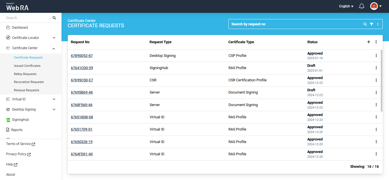 Expand Certificate Center > Certificate Requests to navigate to the Certificate Requests listing screen.
