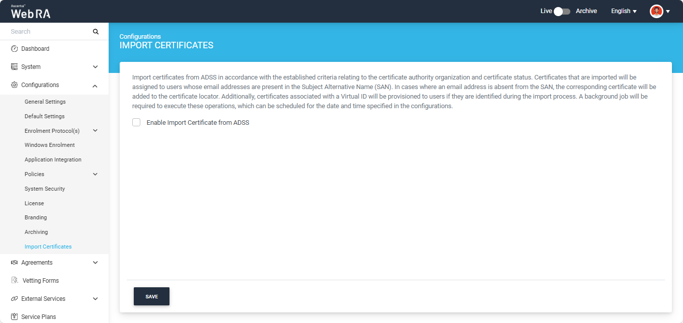 To configure the 'Import Certificates' setting in the system, select the 'Enable Import Certificate from ADSS' checkbox.
