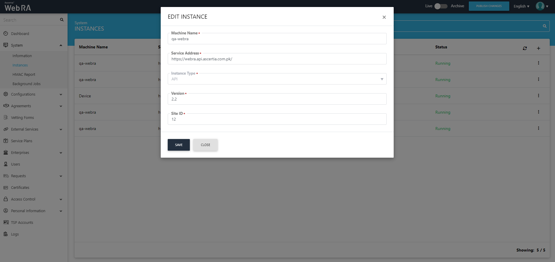 When you install ADSS Web RA as a load-balanced instance through ADSS Web RA installer, an entry is created in the ADSS Web RA database for each instance along with its specific machine IP and URL. All the installed instances are then listed in ADSS Web RA Admin, where an admin operator can monitor their current status and modify their machine name or service address as required. Hence, providing a smart way of publishing the changes on all the ADSS Web RA instances by using a single interface. If the administrator changes the URLs of the website, he/she can use the edit option to add new URLs so that the ADSS Web RA can communicate on that URL to get the website status.