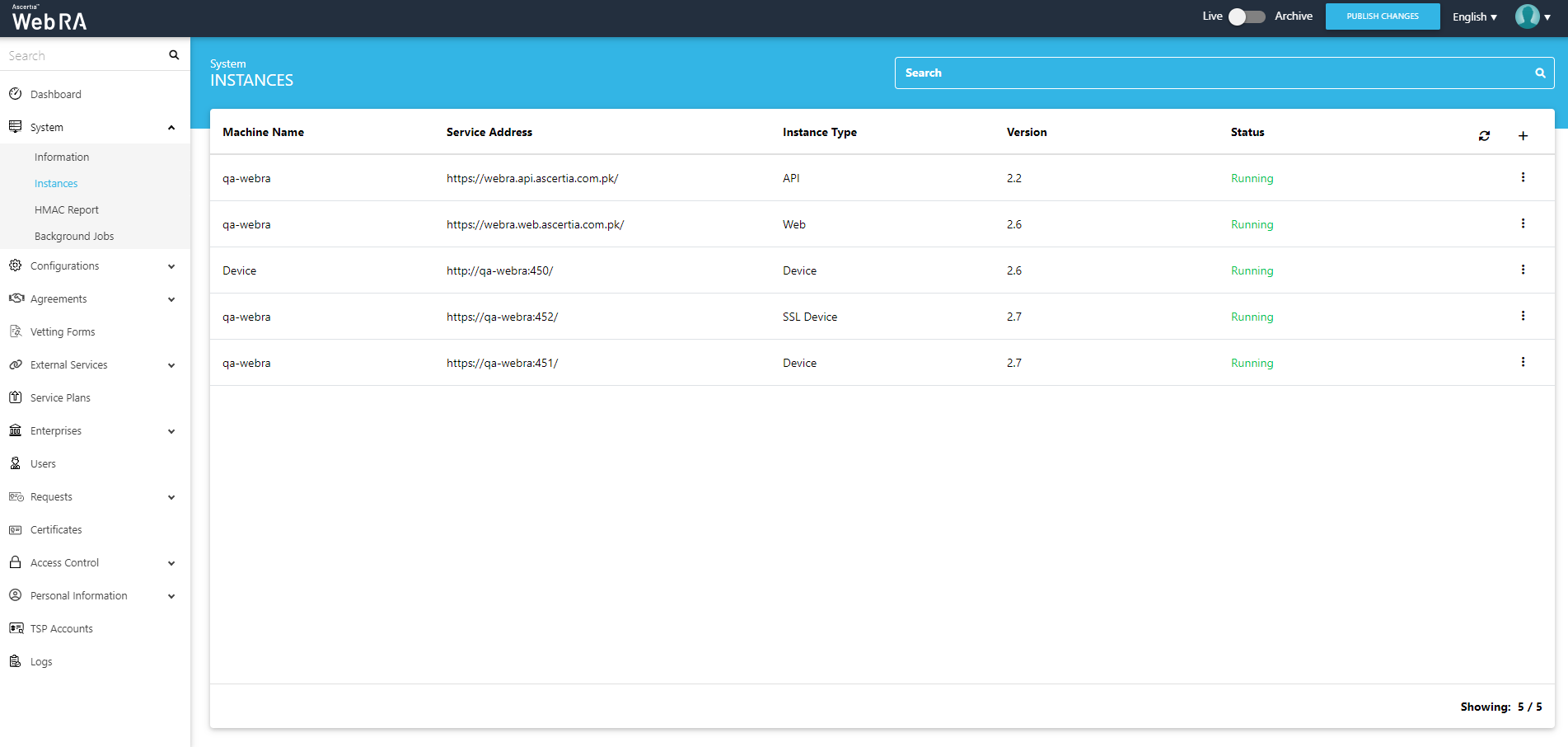 The instances screen will appear listing all the installed instances of ADSS Web RA along with their respective details.