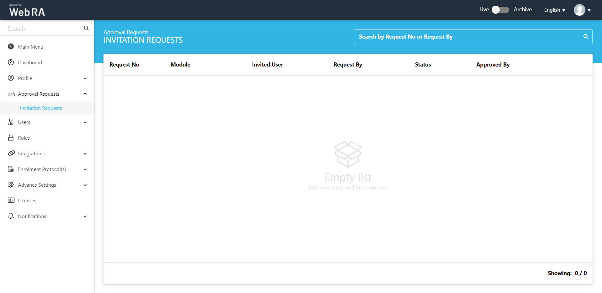 This section consists of all invitation requests listing that belong to a certain enterprise. It includes pending, approved and declined requests.