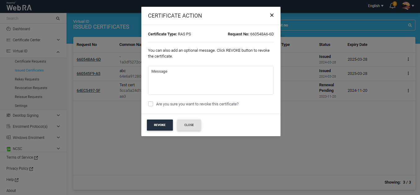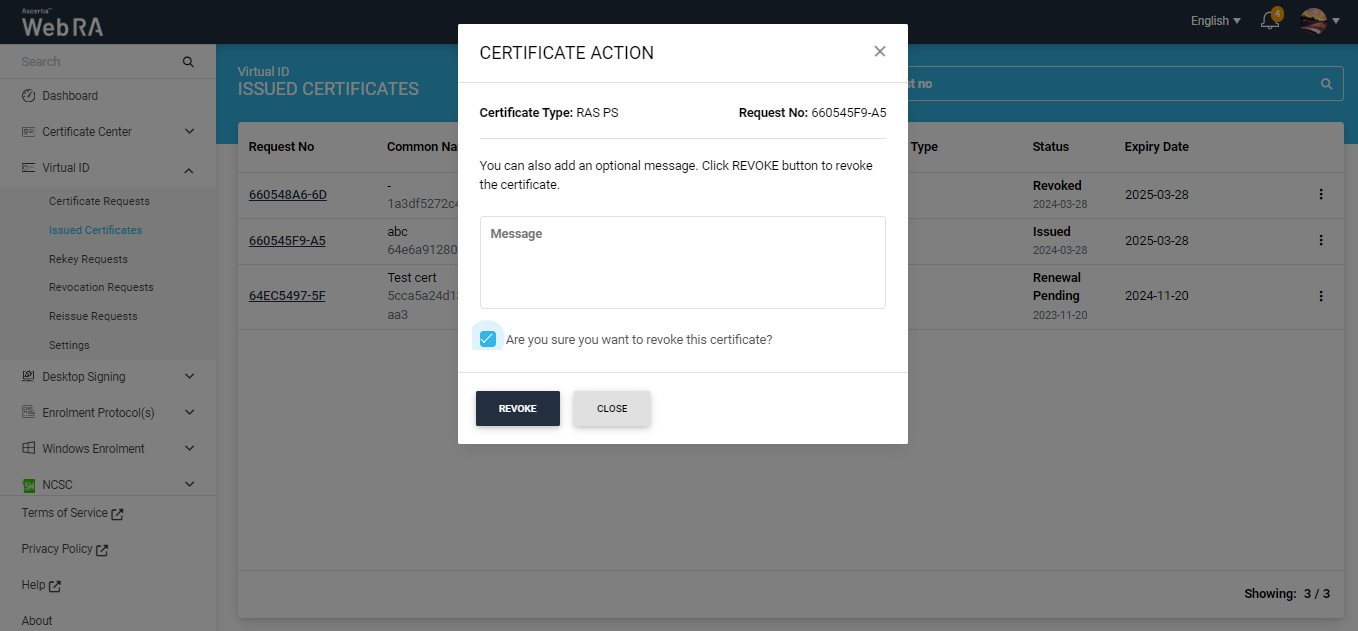 Click Revoke Certificate and the following screen will appear. You can add an optional message and select the confirmation check box, then click Revoke.